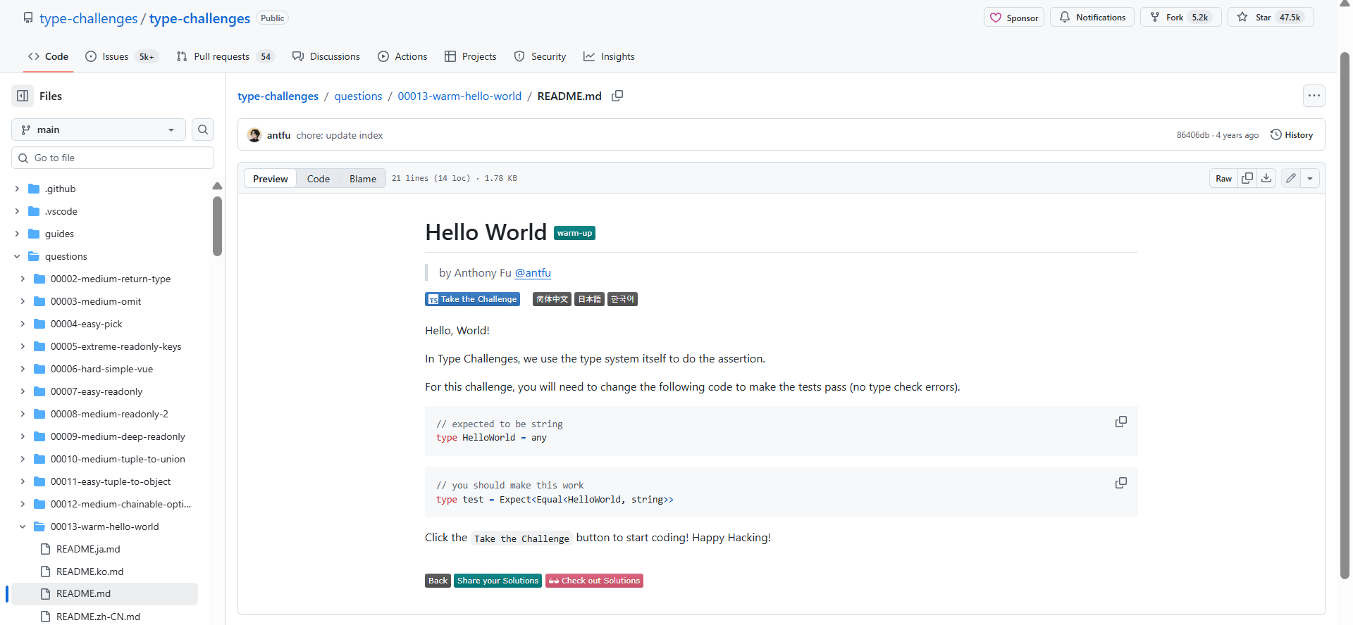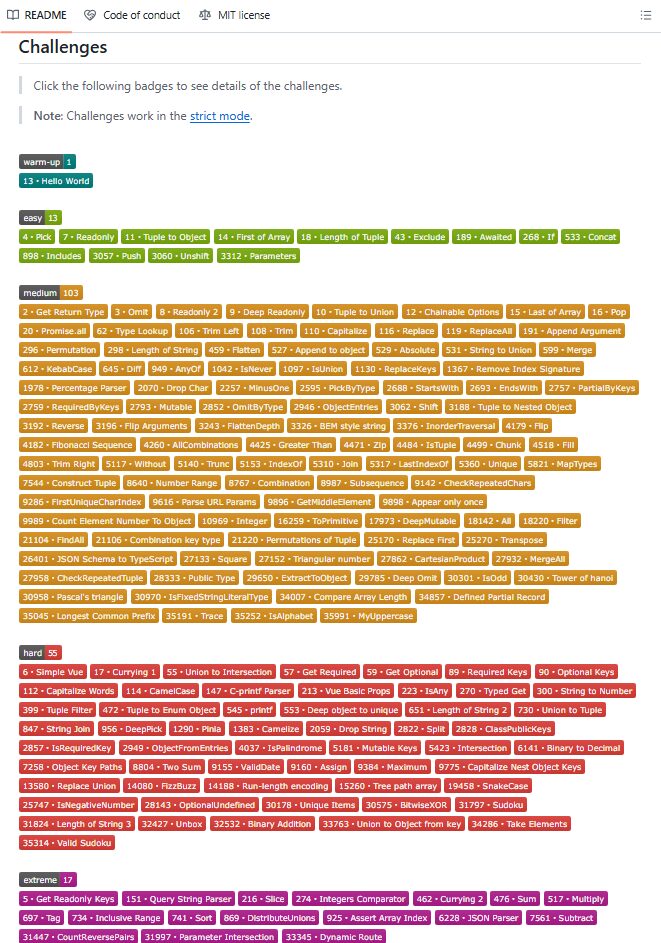 type-challengesは、Githubリポジトリにある「TypeScriptの型に関する問題集」です。